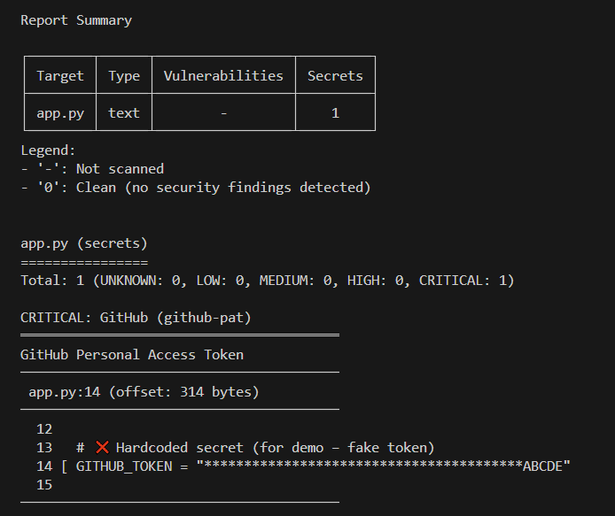 | Trivy | Secrets & filesystem scan | Secrets / SCA |